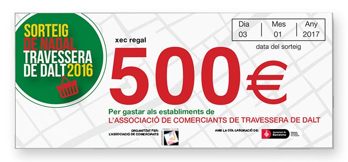 Comprando en los establecimientos adheridos al Associació de Comerciantes de Travessera de Dalt, durante el mes de diciembre del 2016, entrarás en el sorteo de un “Cheque Regalo” de 500€ para utilizar en los comercios y establecimientos de la Associación de Comerciantes de Travessera de Dalt.